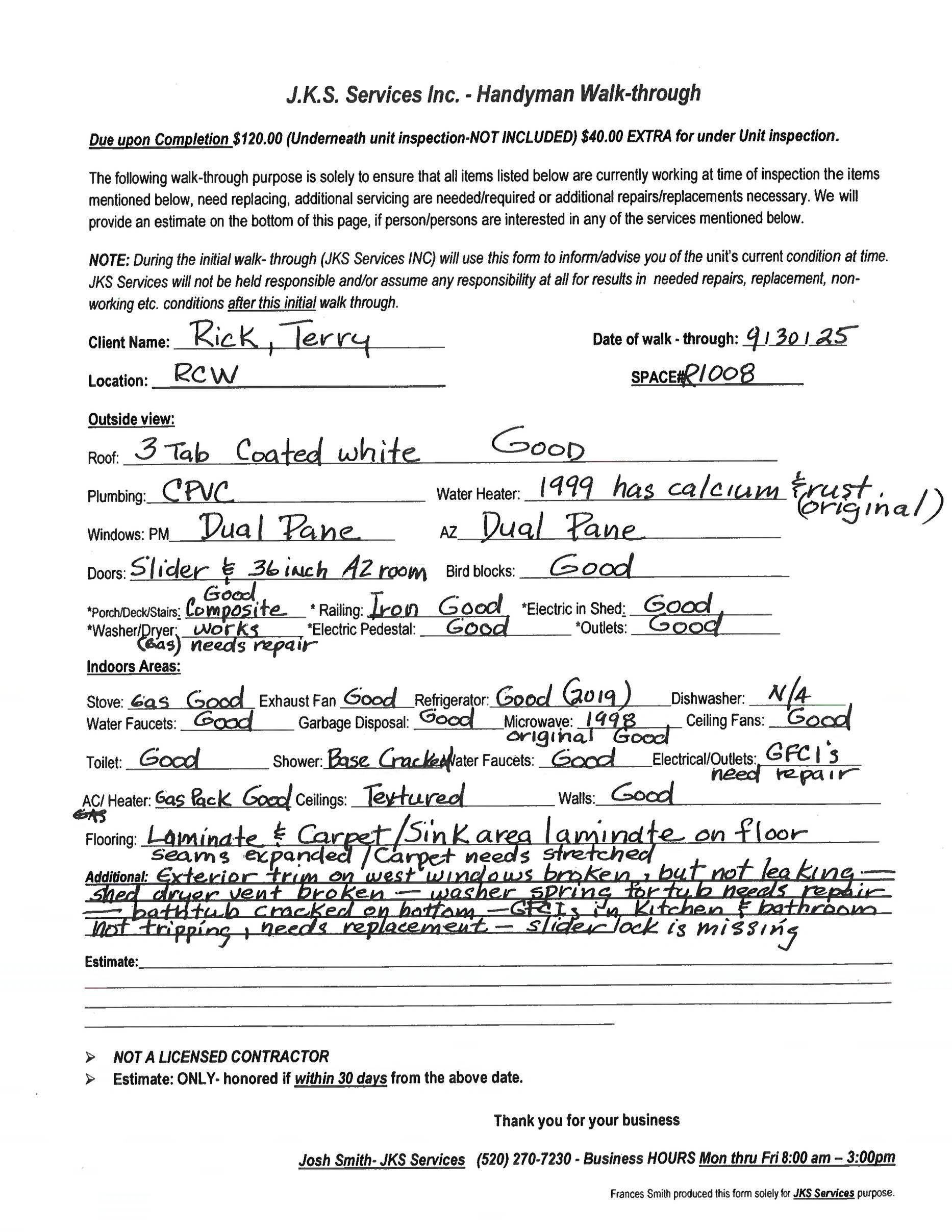 inspection, which was completed by handyman Josh. (He’s a park model expert, who’s